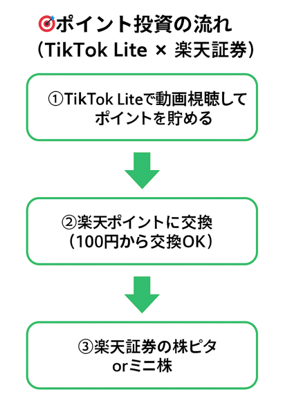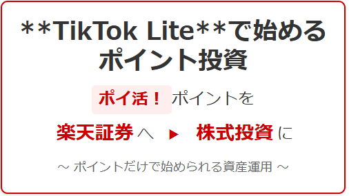 TikTok Liteで動画を見て、ポイントを貯めて、楽天証券で投資するこの流れは、まさに「スキマ時間の資産形成」。 元手ゼロで始められるので、投資初心者にもおすすめです。 気になる方は、まずTikTok Liteをインストールして、えらべるPayの交換先をチェックしてみてください!